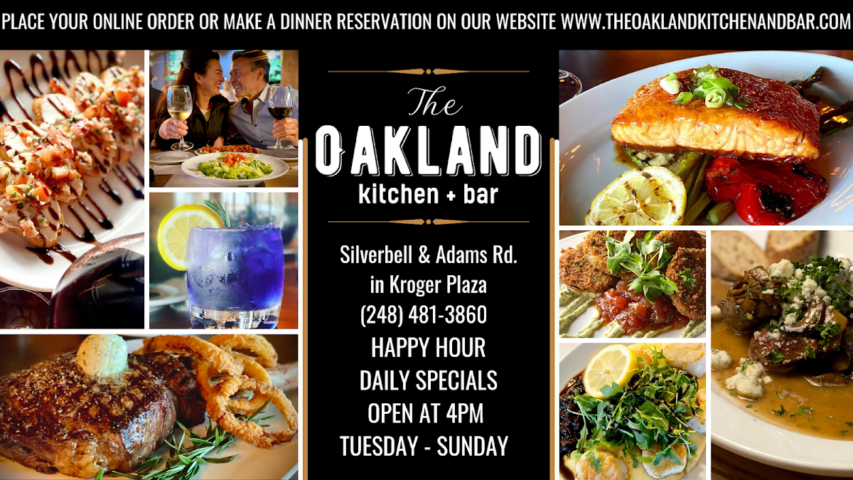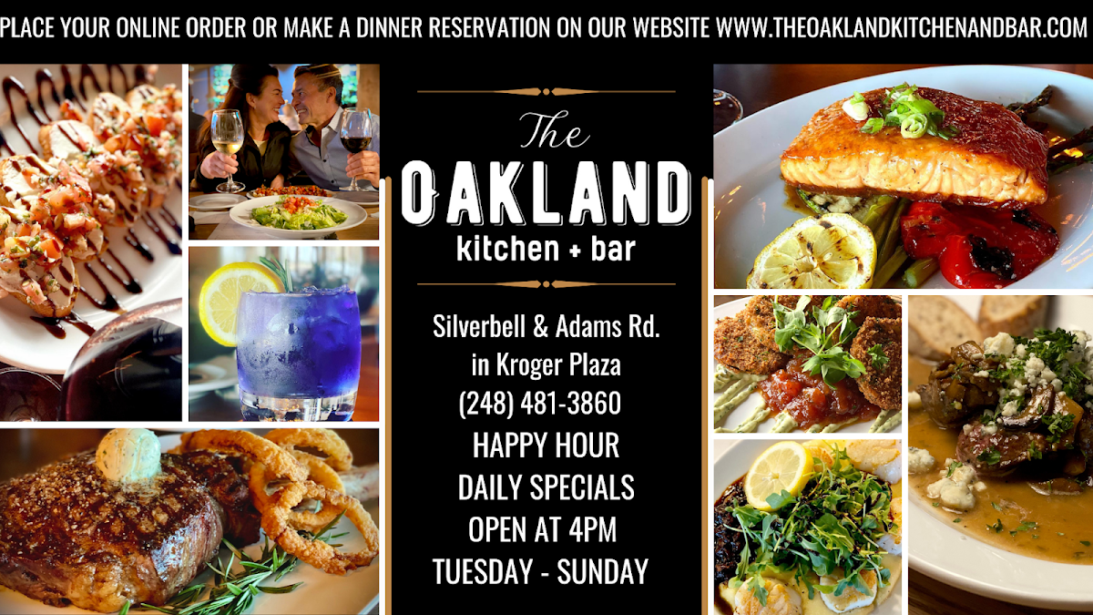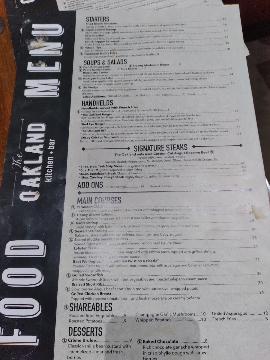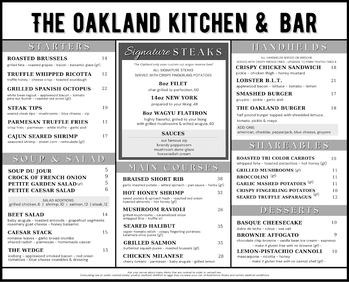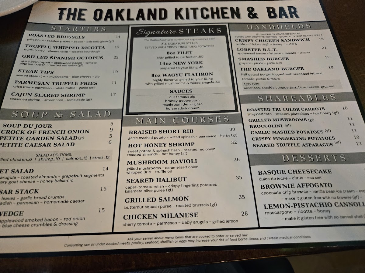 As a reviewer looking back on the menu at The Oakland Kitchen & Bar, what stands out most is the thoughtful balance between comfort, refinement, and variety. The experience often begins with shareable starters like ROASTED BRUSSELS, TRUFFLE WHIPPED RICOTTA, GRILLED SPANISH OCTOPUS, STEAK TIPS, or PARMESAN TRUFFLE FRIES, which immediately set a polished yet approachable tone. Steak lovers are well cared for with signature cuts such as the 8oz FILET, 14oz NEW YORK, and 8oz WAGYU FLATIRON, each reflecting the restaurant’s commitment to quality proteins and classic preparation. For something more casual, the handheld selection-including the CRISPY CHICKEN SANDWICH, LOBSTER B.L.T., SMASHED BURGER, and THE OAKLAND BURGER-offers hearty, satisfying options without sacrificing flavor or presentation. The menu also encourages sharing through well-executed sides like ROASTED TRI COLOR CARROTS, GRILLED MUSHROOMS, BROCCOLINI, GARLIC MASHED POTATOES, and CRISPY FINGERLING POTATOES, which pair effortlessly with any main. Lighter choices are available in the soup and salad section, from SOUP DU JOUR and CROCK OF FRENCH ONION to PETITE GARDEN SALAD, PETITE CAESAR SALAD, and BEET SALAD, providing balance to the richer dishes. Main courses such as BRAISED SHORT RIB, HOT HONEY SHRIMP, MUSHROOM RAVIOLI, SEARED HALIBUT, and GRILLED SALMON showcase a range of flavors that appeal to both meat and seafood enthusiasts. Finally, desserts like BASQUE CHEESECAKE, BROWNIE AFFOGATO, and LEMON-PISTACHIO CANNOLI provide a memorable, indulgent finish. Overall, the menu at The Oakland Kitchen & Bar feels cohesive and confident, making it easy to see why it leaves a lasting impression on diners.